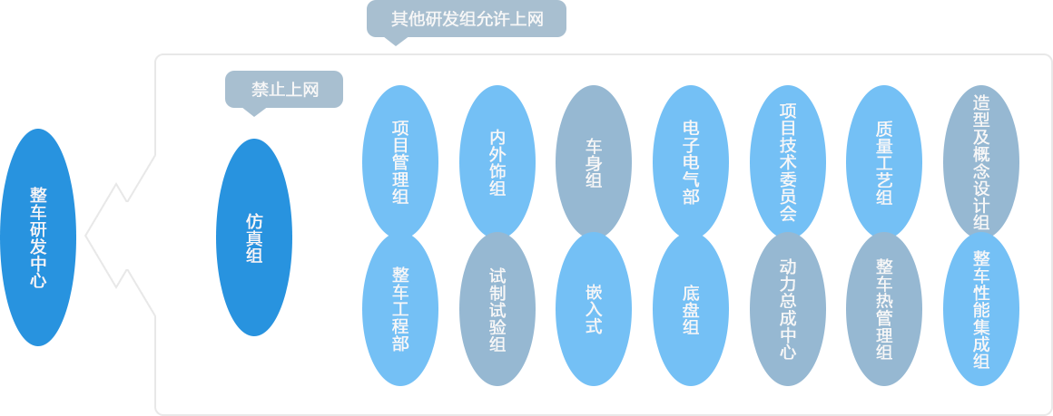 整車研發(fā)中心管理策略:1. 仿真組禁止上互聯(lián)網(wǎng),其他研發(fā)組可以上互聯(lián)網(wǎng),所有研發(fā)組可以互通加密文檔